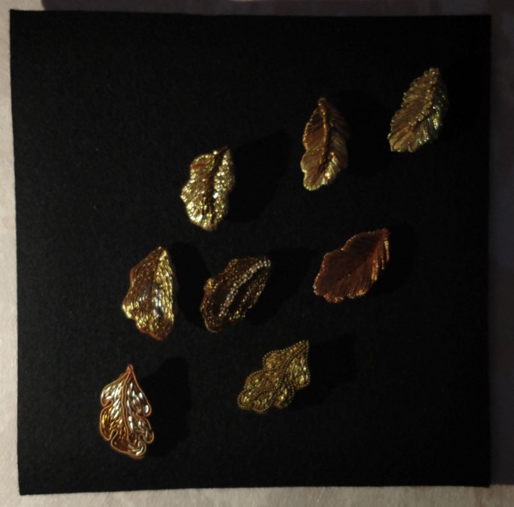 De handgeborduurde eikenbladeren van 2x4cm zijn gemonteerd op wolvilten tegels van 20x20cm.