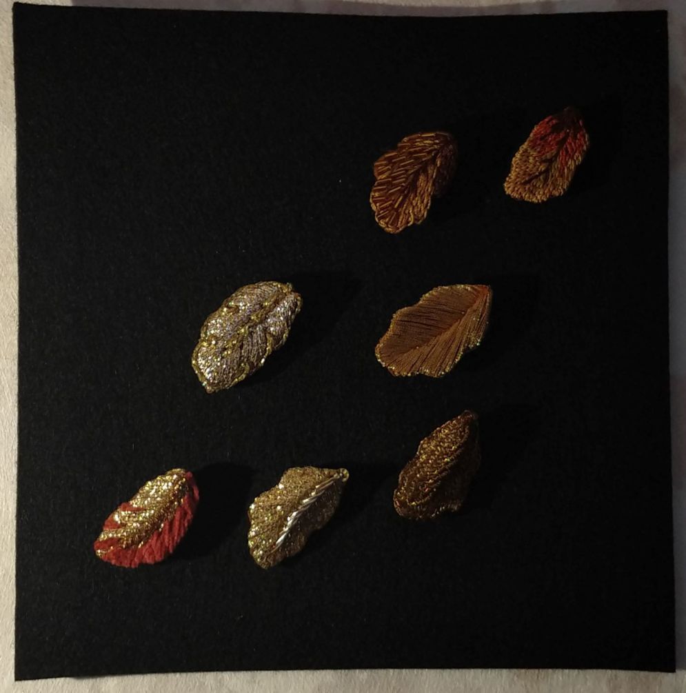 De handgeborduurde eikenbladeren van 2x4cm zijn gemonteerd op wolvilten tegels van 20x20cm.