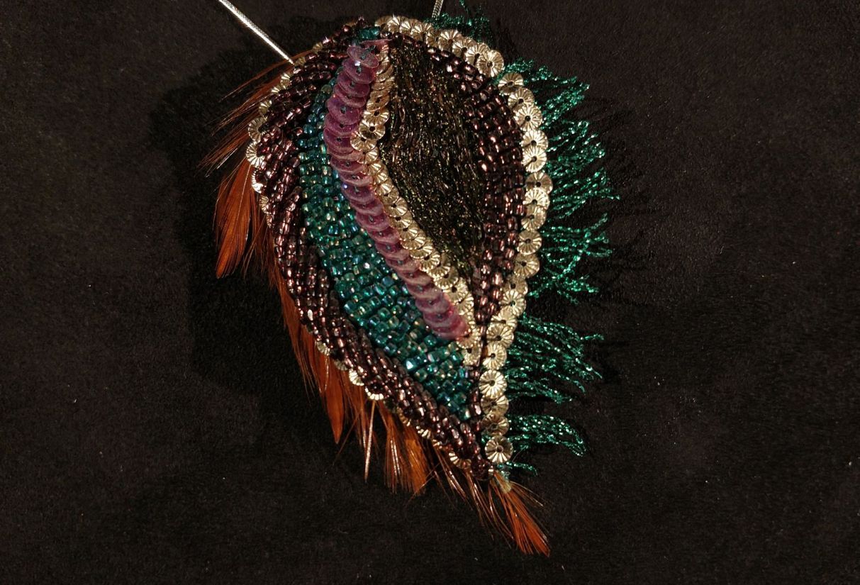 Deze geborduurde hanger van 7,5x5cm is gemaakt in diverse haute couture borduurtechnieken, met kristallen kralen en franse pailletten. Het opvallende aan deze hanger is het borduursel dat met echte pauwenveren geborduurd is en dus ook die kenmerkende groengouden lichtreflectie lheel subtiel laat zien.Hieraan dankt deze hanger ook z'n naam. Deze hanger wordt aan een eenvoudige slangenketting geleverd.