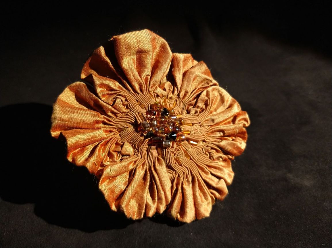 Deze zijden rozet heeft een doorsnede van ca 9 cm. Deze rozet is gemaakt van gepliseerde dupionzijde, en bezet met Swarovski bicones,diverse kralen en cannetilles. De achterkant van deze broche is afgewerkt met soepel leer en voorzien van een brochespeld.