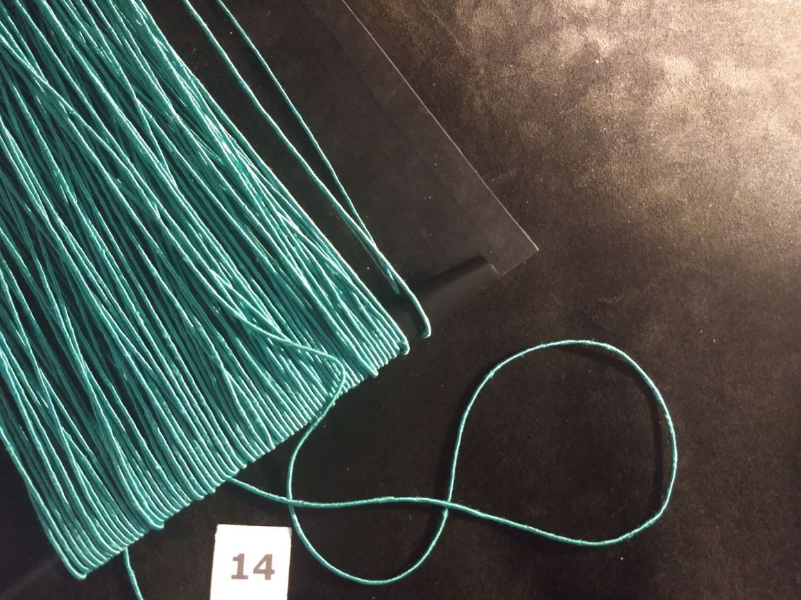 Gimpkoord, een katoenen kern omwikkeld met zijde, met een bijzondere glans zonder twist. Geschikt voor passementen vlechten en voor een bijzonder opvallende toevoeging aan borduurwerk. ca 1 mm breed, €1,75 per 3 meter