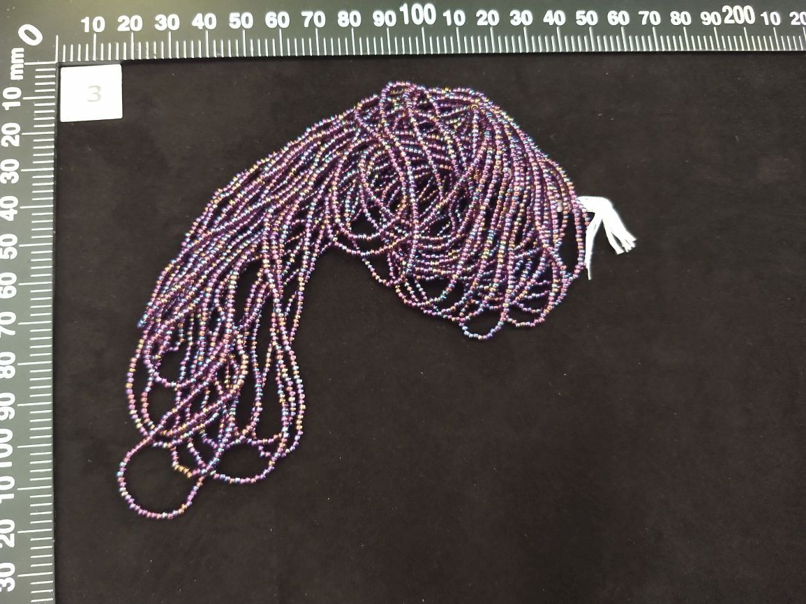 Donker aubergine rocaille iriserend: kralen in haute couture kwaliteit op draad, deze kralen zijn transparant met een iriserende finish. Ronde kraal 2,2 x 1,5 mm, Geleverd op een draad van ca 52 cm, bundel van 12 draden voor €10,50
