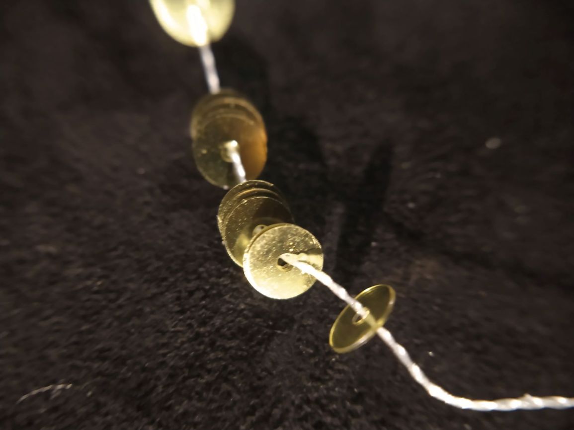 Haute couture pailletten op draad Ook pailletten worden op draad geleverd om met een lunevillenaald verwerkt te kunnen worden. Pailletten kunnen we onderverdelen in platte pailletten en cups of cuvettes, holle/bolle pailletten. De meeste pailletten zijn rond, met enorme variatie in afwerking van pailletten, bv transparant, iriserend, metallic, mat, gevlamd.